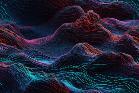 This stunning abstract image showcases a colorful 3D landscape representation with intricate lines depicting topographical features of peaks and valleys.