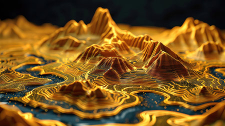Contour lines creating a topographic model of a mountain range, visualizing elevation and terrain. Generative ai