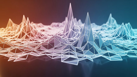 A wireframe 3D landscape with sharp, geometric peaks and valleys a color gradient from orange to blue, with reflections on a dark surface.