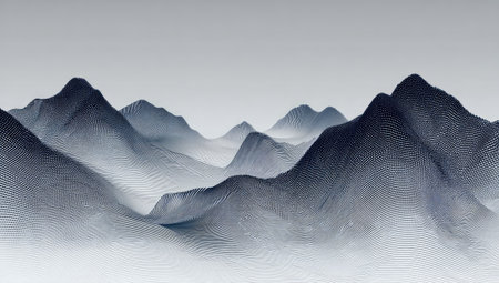 An illustration depicts a series of mountain peaks rendered in shades of gray. The composition features a gradient background suggesting depth and atmospheric perspective. The style evokes a sense of calm and tranquility with its minimalist aesthetic. This image is suitable for a variety of editorial and commercial applications.