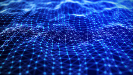 Abstract 3d rendering of chaotic wavy surface. Futuristic background with dynamic particles.