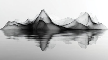 Black and white abstract mountain landscape reflected in calm water, creating a serene and minimalistic viewpoint. Generative AI