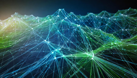 A mesmerizing abstract image featuring vibrant blue and green network lines. This futuristic design symbolizes connectivity, data flow, and the advanced infrastructure of modern technology.