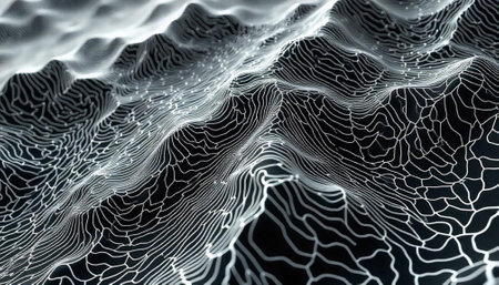 An abstract illustration shows a detailed topographic surface, rendered with layered contour lines. The image showcases variations in elevation and terrain, with a gradient of blue and beige hues suggesting depth and dimension. This design could be used in various applications, including scientific visualizations, educational materials, and design projects.