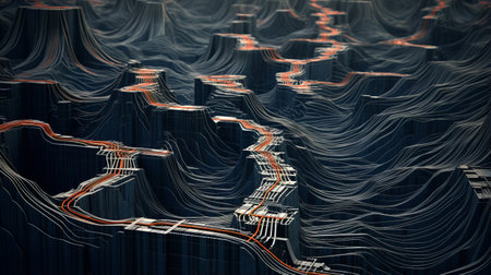 a 3d printed landscape featuring red wires, showcasing an aggressive digital illustration style. the piece is characterized by dark indigo and orange tones, creating a futuristic urban atmosphere. the repetitive rephotography technique adds a unique touch, while undulating lines and pixelated elements contribute to the surreal and dreamlike quality of the landscapes. ai generated