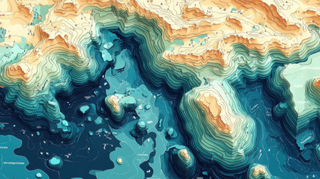 Explore this vibrant topographic illustration showcasing ocean depth and terrain. Intricate contour lines depict underwater features in stunning detail.