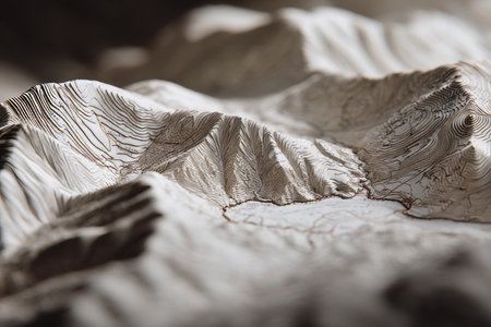 Intricate close up of a topographic map highlighting mountainous terrain and natural features