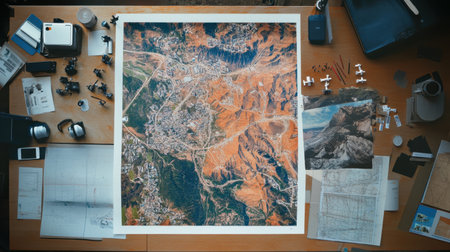 Digital terrain modeling printout next to markers and aerial drone photos on a civil engineers table