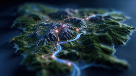 Topographic relief map showcases mountains and rivers, highlighting cartography and topography. Ai Generated