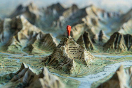 A topographic representation displays intricate details of mountain ranges, with a prominent peak marked by a bright red pin to indicate a specific location within the landscape.