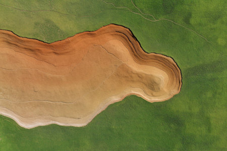 Aerial view of colorful earth formations with vivid green grass background, showcasing unique textures and shapes for landscape photography enthusiasts