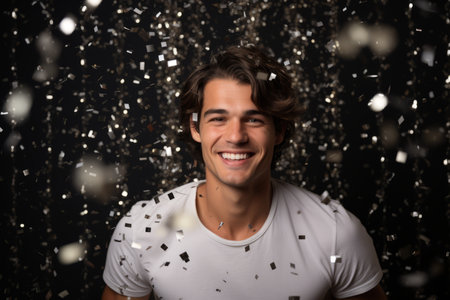 A Handsome Brunette Man Holding Sparkling Tinsel, Posing with a Joyful Smile in Front of a Shimmering Silver Backdrop, Creating a Magical Christmas Atmosphere