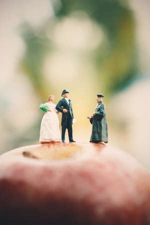 Miniature photography - outdoor garden wedding ceremony concept, bride and groom walking on white rose flower pile