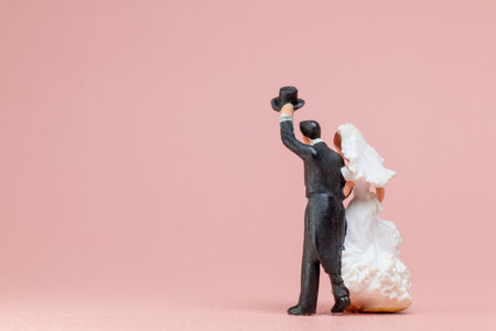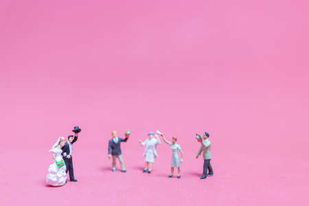 Wedding celebration concept miniature people, toys photography. Bride and groom standing above podium platform isolated on pink background. Image photo