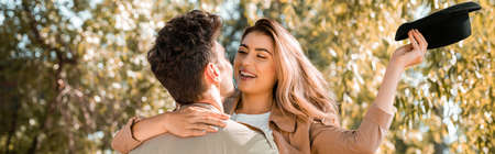 excited woman with hat hugging boyfriend in autumnal park, panoramic shot
