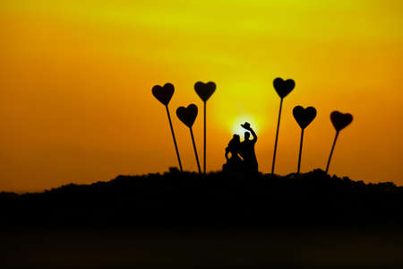 silhouette of wedding Couple statue holding hand together during sunset with evening sky background. Wedding concept. Selective focus