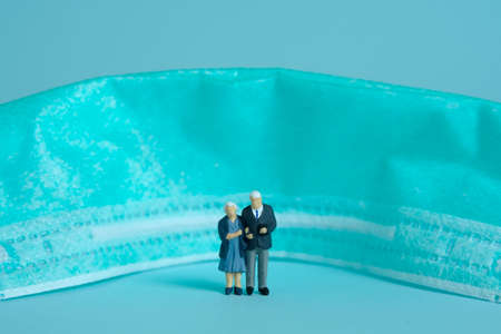 Pandemic corona virus quarantine, isolation conceptual miniature people photography – old elder people middle-aged figure standing with green face mask