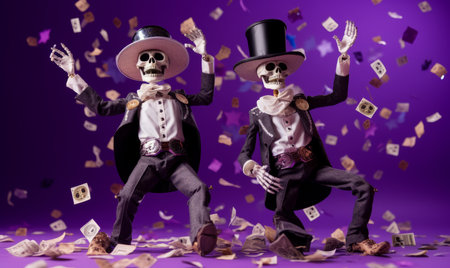 Halloween party concept. Two funny skeletons in carnival costumes dancing on purple background.