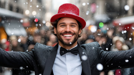 A smiling man in a festive hat looks up in wonder, surrounded by colorful bokeh lights and confetti.