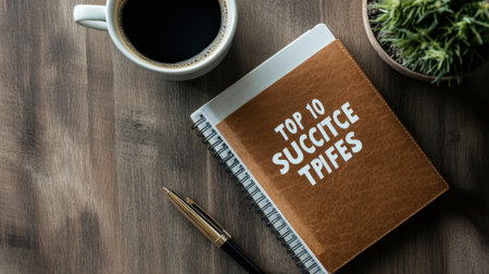 A notebook with 'Top 10 Success Tips' written at the top, next to a pen and coffee
