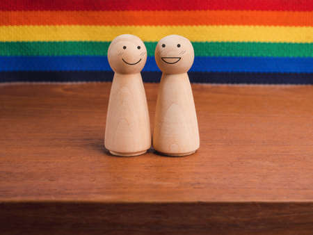 Couple concept. Two wooden figures with skirt shapes, with happy smile faces standing together on the wood table on the rainbow flag background.