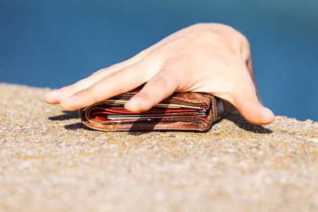 Man thief finding wallet on sea shore taking stealing it. Leaving belongings unattended and risk of theft
