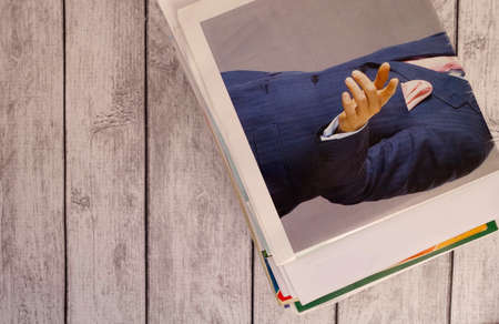 Waste paper on a light wooden background. A stack of unnecessary papers, business magazines and printed publications. Disposal to the archive