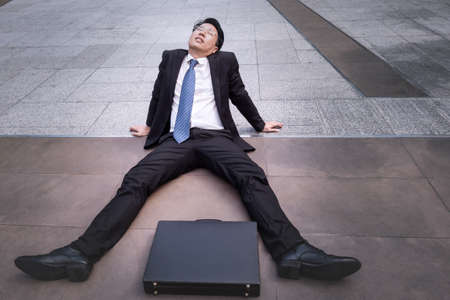 Asian businessman wearing glasses tired and briefcase for working, lay down on the floor