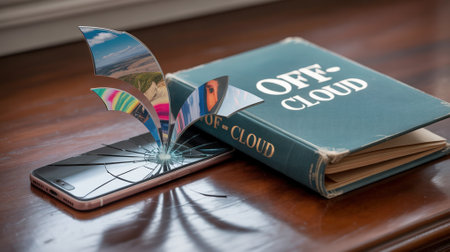 Printed photos emerging from broken smartphone screen near off cloud book