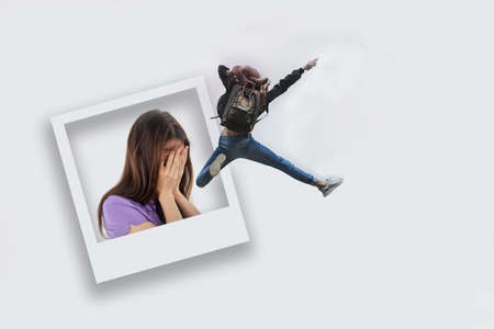 A female covering her face in a frame with a female jumping on a white background