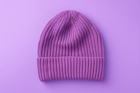 a pink beanie hat on top of a purple surface,solid background color, top view, flat lay