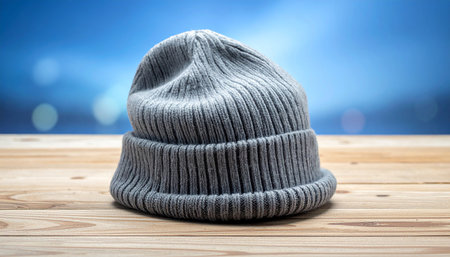 A gray ribbed knit beanie hat is angled slightly on a wooden table. The background is a blurred blue with bokeh lights.