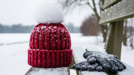 Cozy winter magic with knitted hat and mittens on snowy day.