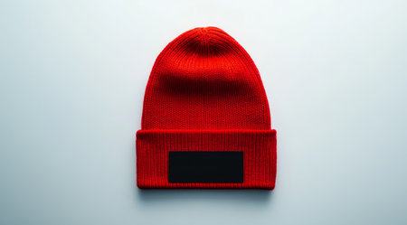 Stylish red knitted beanie hat featuring a black unbranded mockup label for customization. Perfect for winter fashion and promotional branding