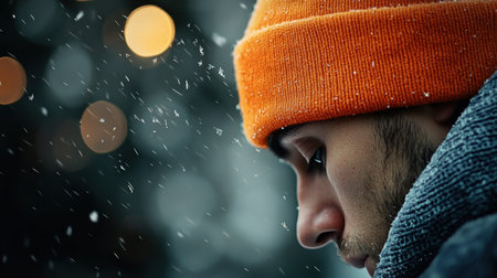 Stylish young man wearing a trendy beanie hat and a warm winter coat, posing in a snowy urban landscape filled with falling snowflakes