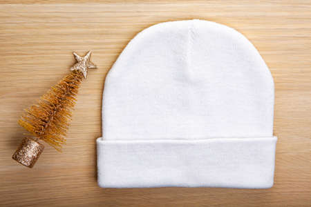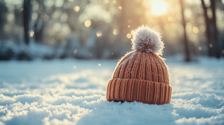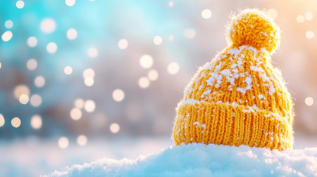 a woolen hat amidst a snowy landscape, empty space for text, creating a perfect canvas for seasonal messaging