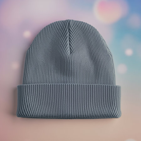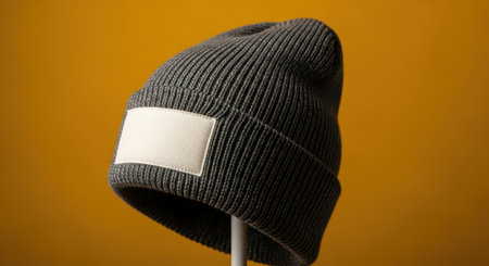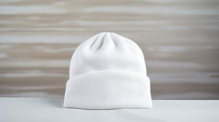 Photo of a beanie hat mockup on a plain background, captured in a close-up shot with soft shadows, showcasing a modern and minimalist vibe
