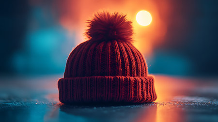 This charming knit cap features a stylish pom pom on top, creating a cozy look perfect for winter. Surrounded by warm, blurry lights, it serves as a festive inspiration.