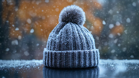 Generative AI Image of Cozy Knitted Winter Hat on Sleek Surface with Snowfall Background