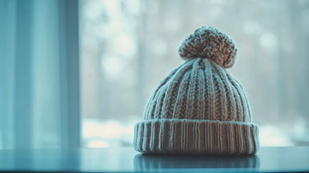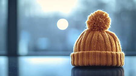 Generative AI Image of Cozy Knitted Winter Hat on Sleek Surface with Window Home House Background