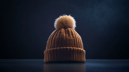 A close-up shot of a stylish brown knitted beanie with a fluffy pompom. Perfect for winter.