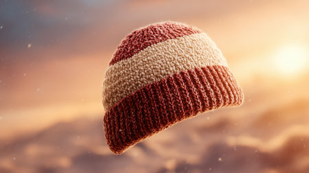 This image features a cozy knitted hat with a striped pattern, gracefully floating in the air with a stunning sunset and soft clouds as the backdrop. Perfect for winter themes.