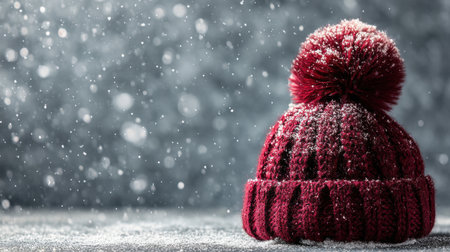 A cozy red knit hat adorned with a fluffy pompom is showcased in a snowy setting. The gentle snowfall creates a serene winter atmosphere, perfect for seasonal fashion.