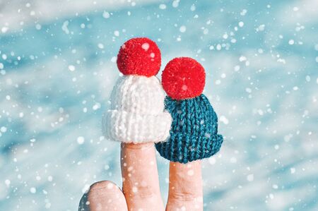 Funny couple fingers in knitted woolen hats against snowflake blue winter background.