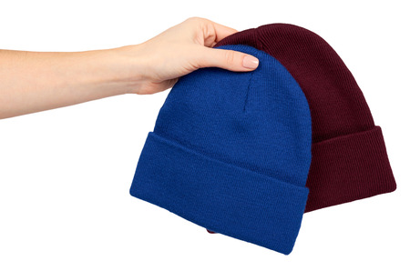 Hand with knitted wool hat, head accessory clothing. Isolated on white
