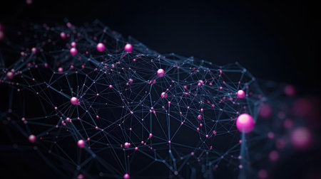 A dynamic network of interconnected nodes vibrantly displayed in neon pink against a dark backdrop. A modern, futuristic ambiance creates depth and intrigue in the design.