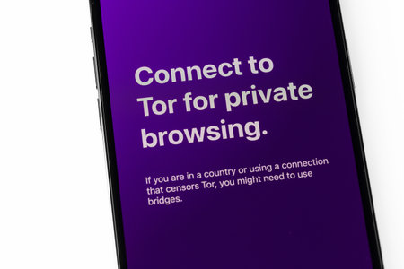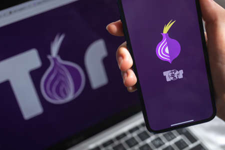 SPB, Russia - April 15, 2022: Tor browser app. logo closeup. Smartphone in hand with secure and privacy VPN application