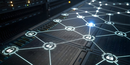 A network of glowing security locks interconnected on dark server hardware. The background is dark and unclear. The image evokes a sense of advanced technology and robust security. No people are present.
