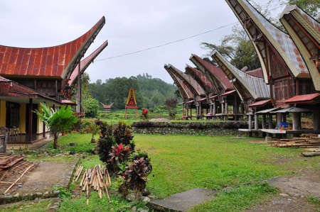 PALAWA, INDONESIA - JULY 3 2012: typical Torajan ethnicity ancestral houses, called Tongkonan, in a dull day