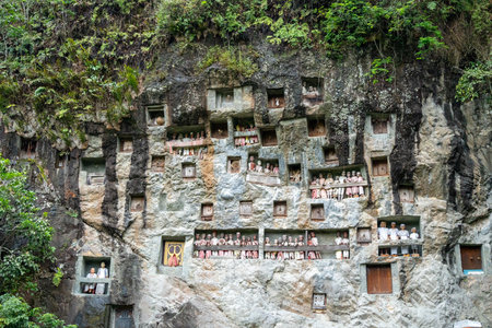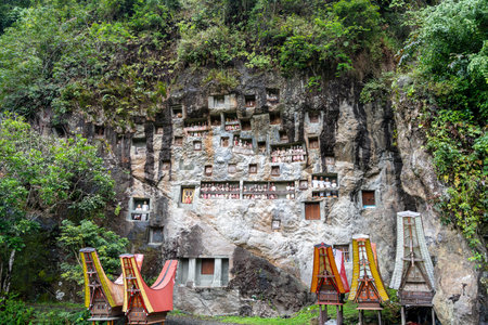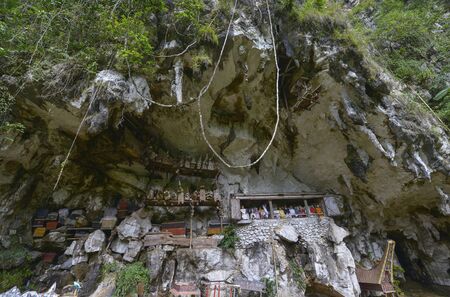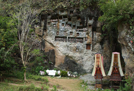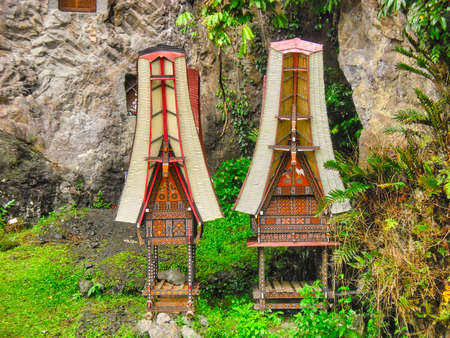 Traditional burial site in Tana Toraja, South Sulawesi, Indonesia, where coffins are placed in caves carved into the rock or in tongkonan, decorated wooden buildings with outstanding boat shaped roof.